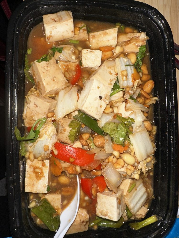 Peanut, cabbage, carrot, onion, bell pepper, cilantro. Served with jasmine rice.