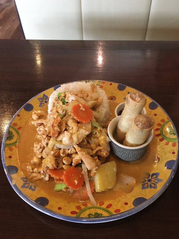 Mild spice level. Potato, onion, carrot, peanut. Served with jasmine rice.