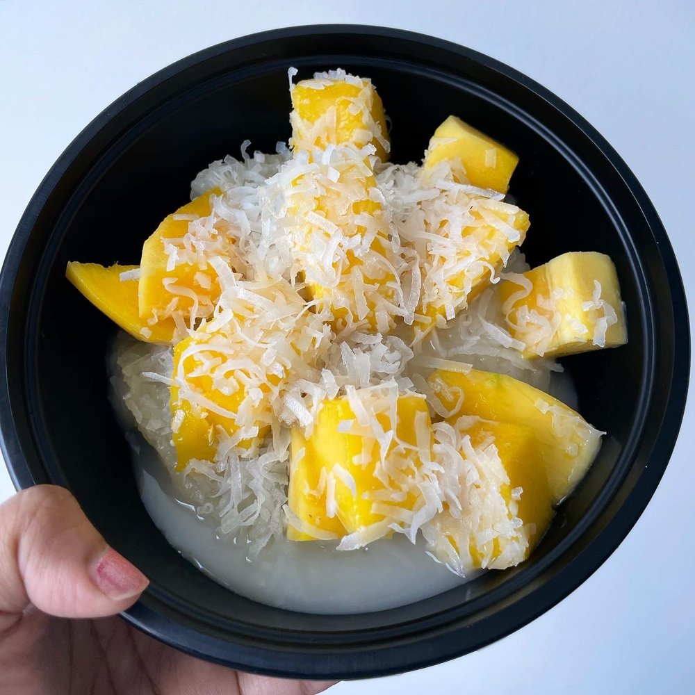 Fresh mango on top of warm coconut sticky rice, topped with sweet coconut cream sauce.