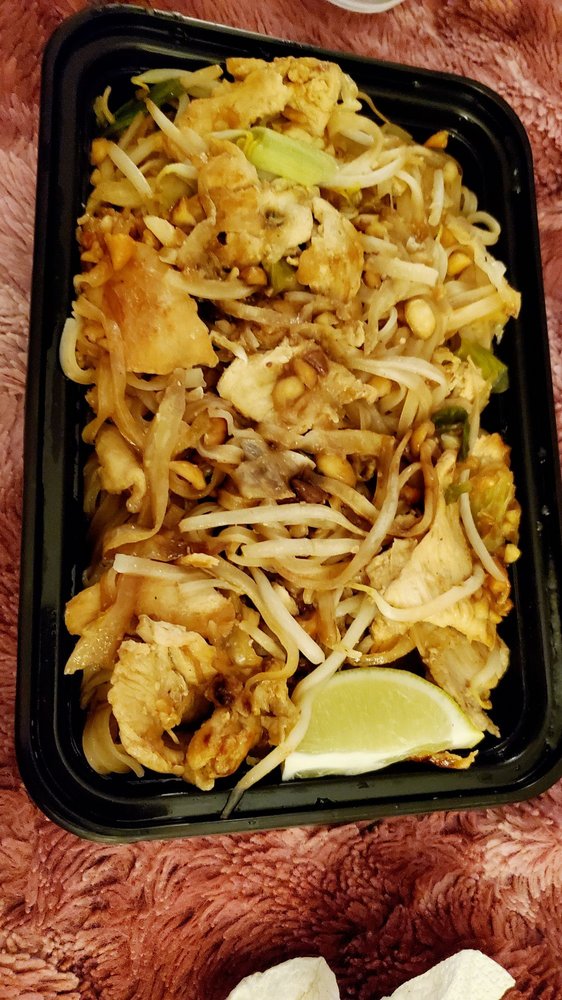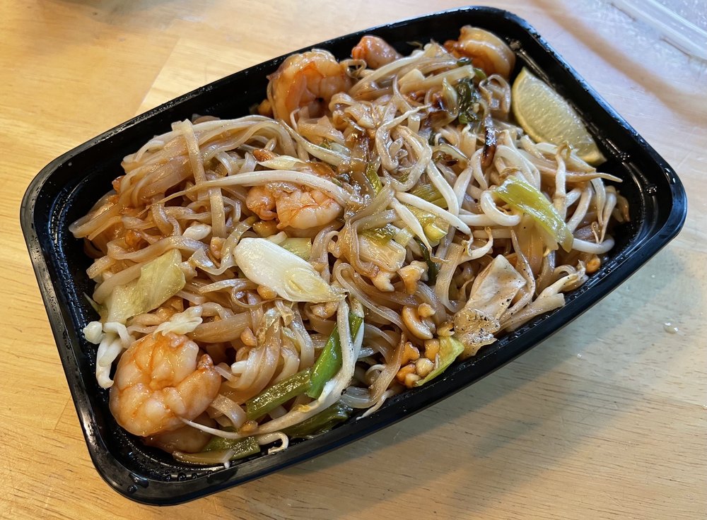Chewy thin egg noodles, cabbage, onion, bell peppers, bean sprouts, scallion, sesame oil.