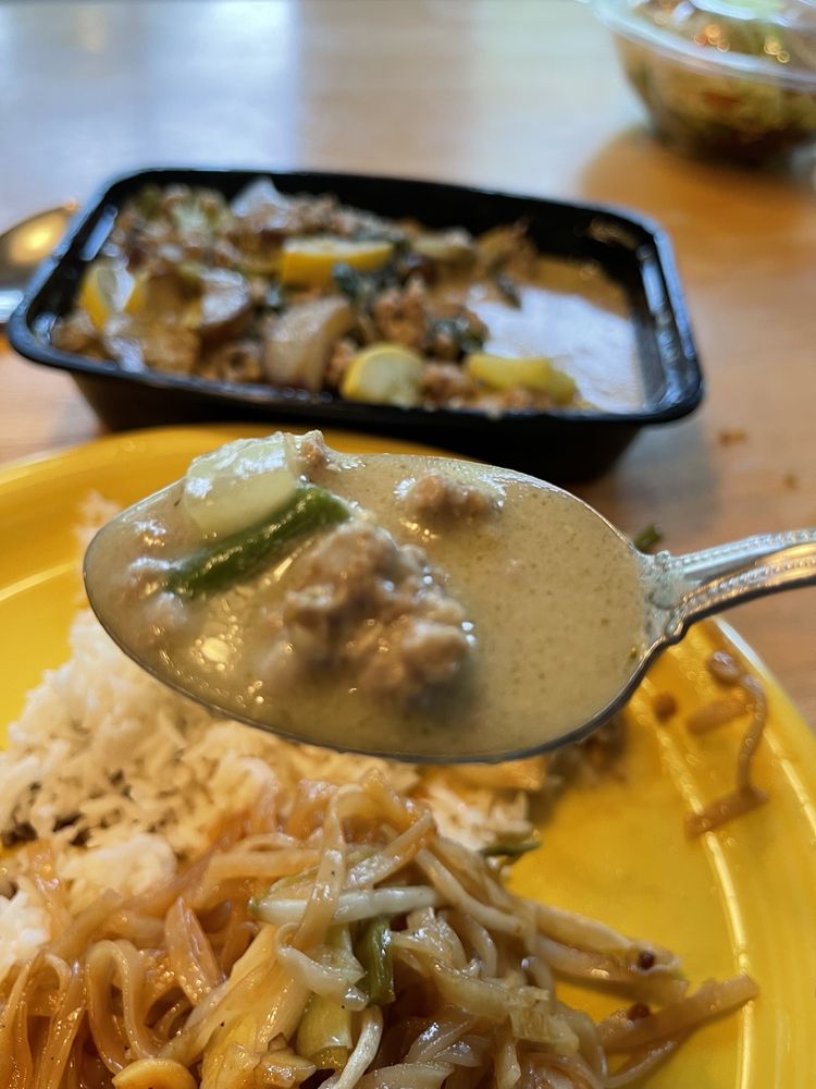 Medium spice level. Broccoli, eggplant, green bean, onion, basil. Served with jasmine rice.